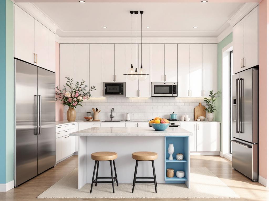 Цветовые решения для кухни: Связь с «Цветом года» или трендами. Как светлые тона визуально расширяют пространство, а акцентная стена может зонировать помещение.